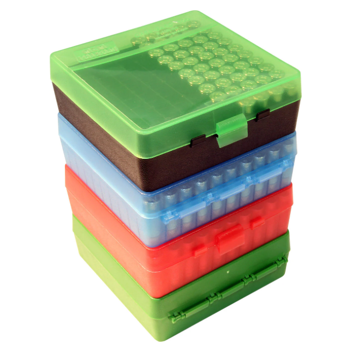 MTM originated the 100 round flip-top handgun ammo boxes over 30 years ago. The Case-Gard P-100’s are the perfect ammo carrier for the handgunner who wants to spend several hours at the range. Ideal for storing reloads. They have an easy to grip, scuff-resistant textured surface and are stackable. The Snap-Lok latch and full length mechanical hinge are guaranteed for 25 years. Calibers for each box our listed on the bottom of each box. Load label included.
